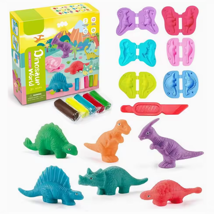 Complete Set: Includes 5 pieces of playdough + 6 dinosaur molds